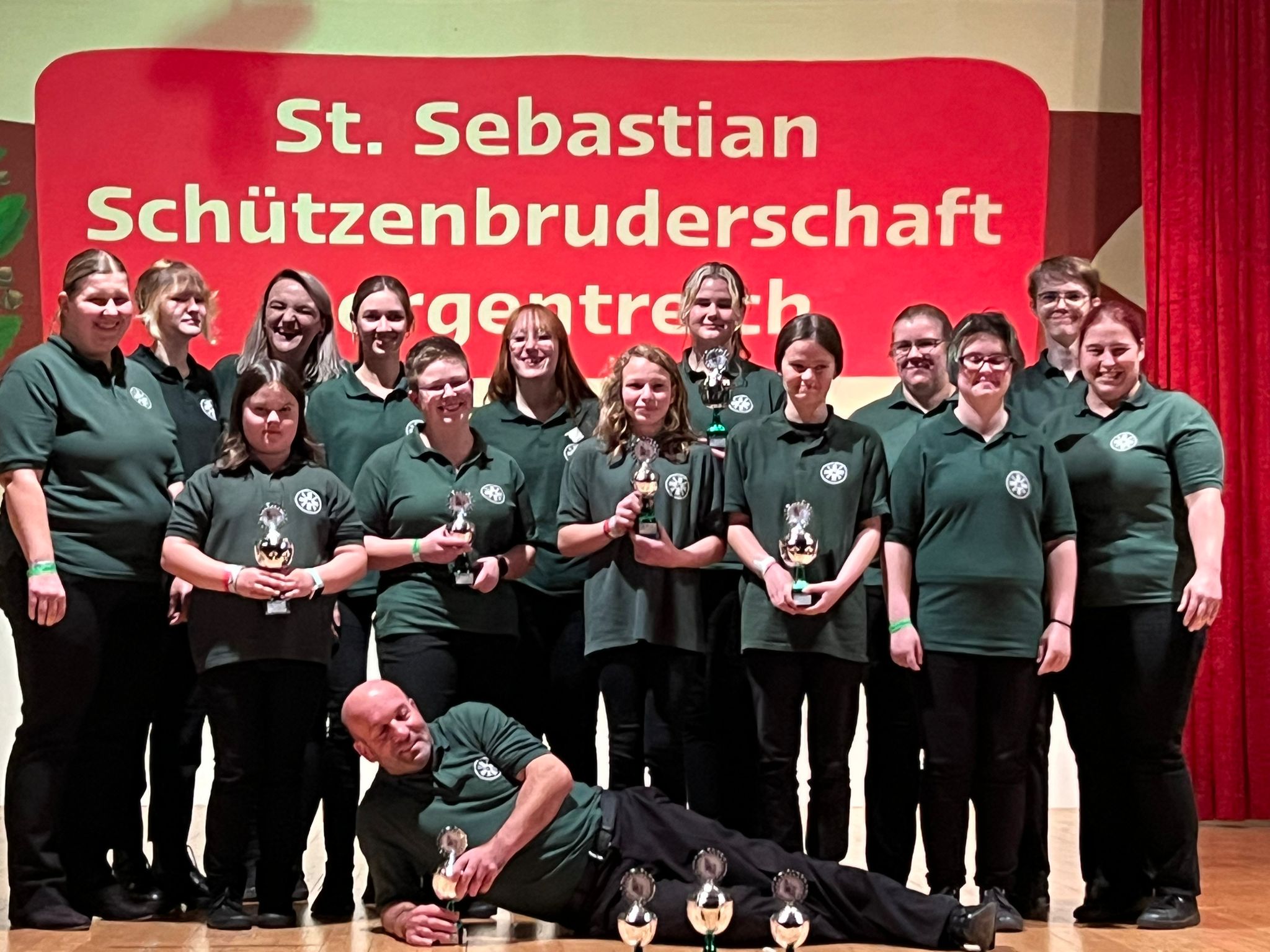 Die Fahnenschwenker der St. Sebastian Schützenbruderschaft bei der Ankunft in der heimischen Schützenhalle mit einer Menge Pokale im Gepäck. v.l. Sabrina Rengel, Anastasia Kohlisch, Bea Schroeder, Anna-Lena Cajka, Anna-Theres Kremper, Laura Wittkopp, Ronja Fusch, Stella Battaglia, Alissa Kohlisch, Amber Schroeder, Kirsten Laqua, Zoe Schroeder, Silas Kremper und Daniela Stamm sowie liegend Rüdiger Kröhn. „Gemeinschaft erleben!“ …